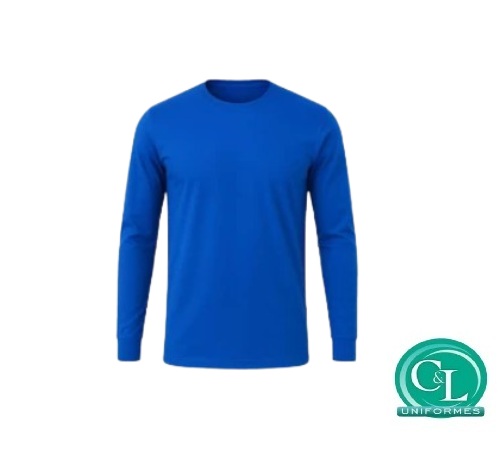 Camiseta Gola Careca na Malha 100% Algodão Manga Longa azul royal é a escolha ideal para quem precisa de um uniforme resistente e confortável. Feita com tecido de alta qualidade, oferece excelente resistência ao desgaste, sendo indicada para trabalhos que exigem proteção extra. Seu corte permite um ajuste confortável e design sofisticado.